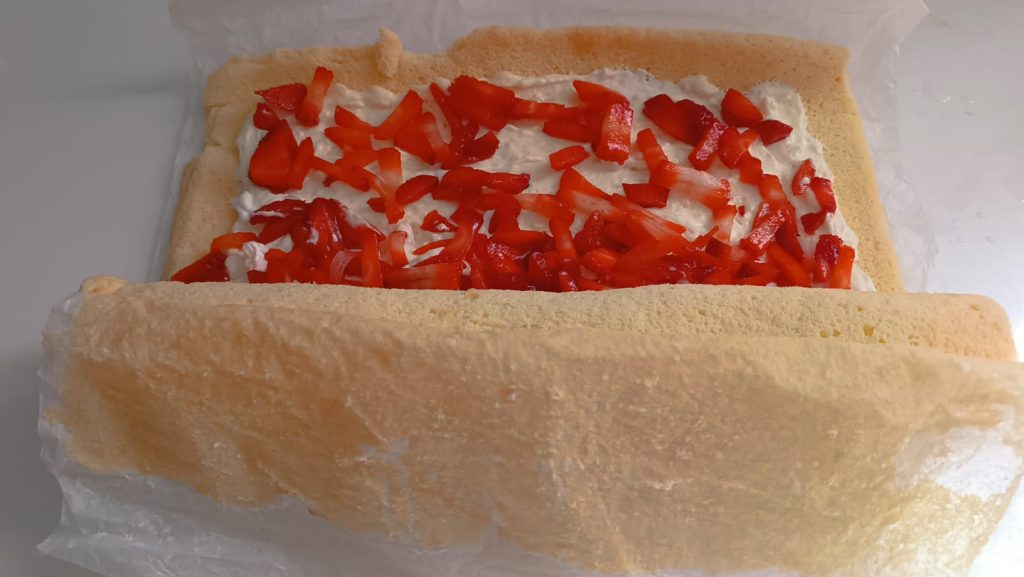 Unroll the sponge cake, add the cream and strawberries, leaving the edges free.
