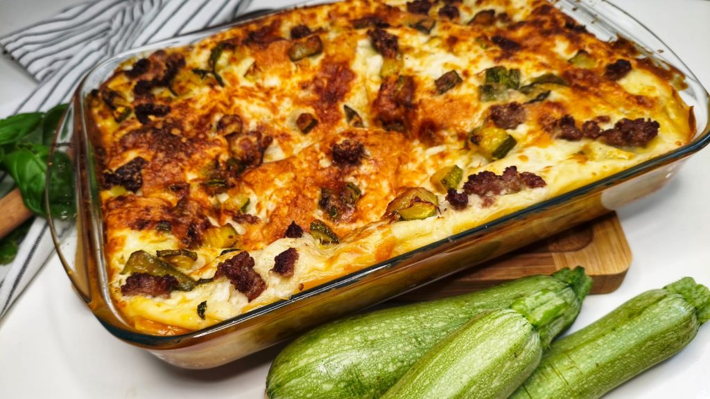 The combination of the delicate flavor of zucchini and the richness of sausage creates a delightful contrast, enhanced by the creaminess of the béchamel and the golden gratin of the cheese.