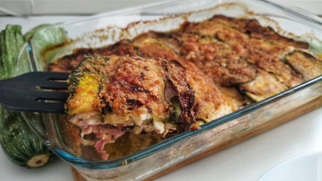 This no pasta zucchini lasagna can be made in two ways: if I have a bit more time, I grill the thin slices to add more flavor. But if you slice the zucchini very thinly with a mandolin, you can easily use them raw, and the lasagna will still be tender and flavorful. The important thing is to make well-layered stacks of zucchini, cooked ham, and melting mozzarella. A sprinkle of Parmesan between layers never hurts, and the result is a creamy and irresistible dish!