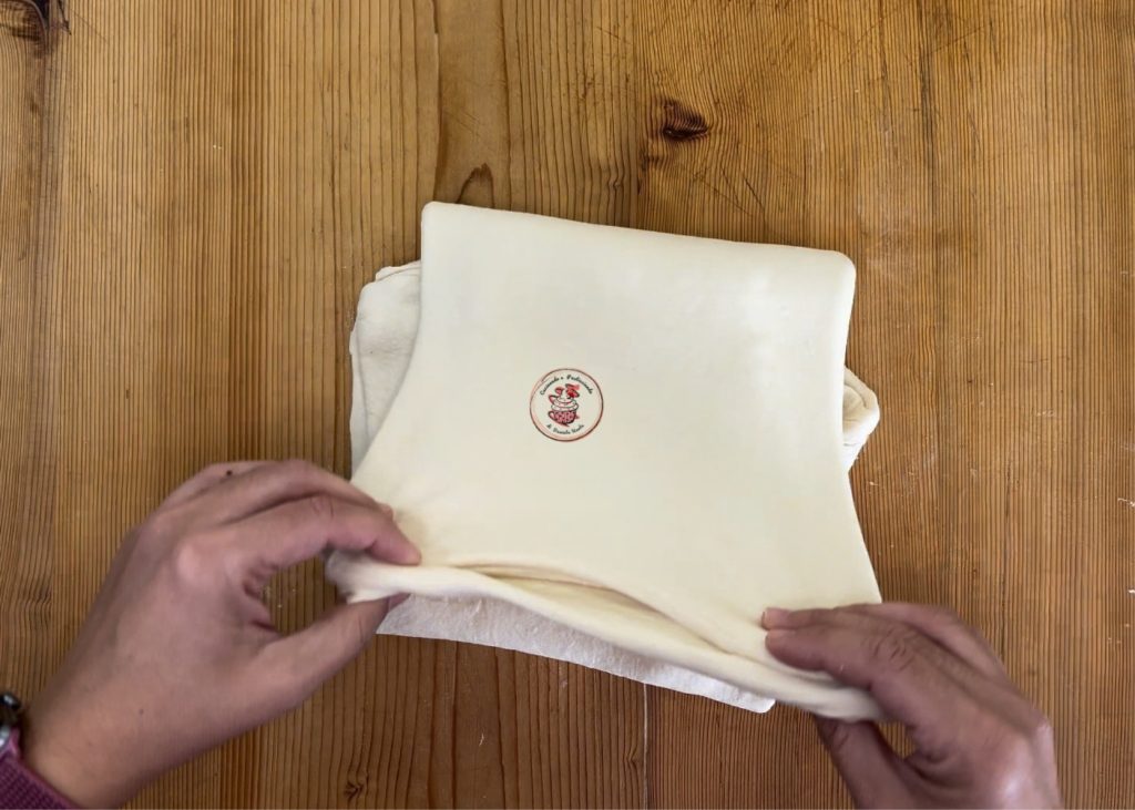 • Spread out the dough as much as possible like a sheet on the work surface, this step is called lamination (it helps to give air to the dough, and form bubbles inside).