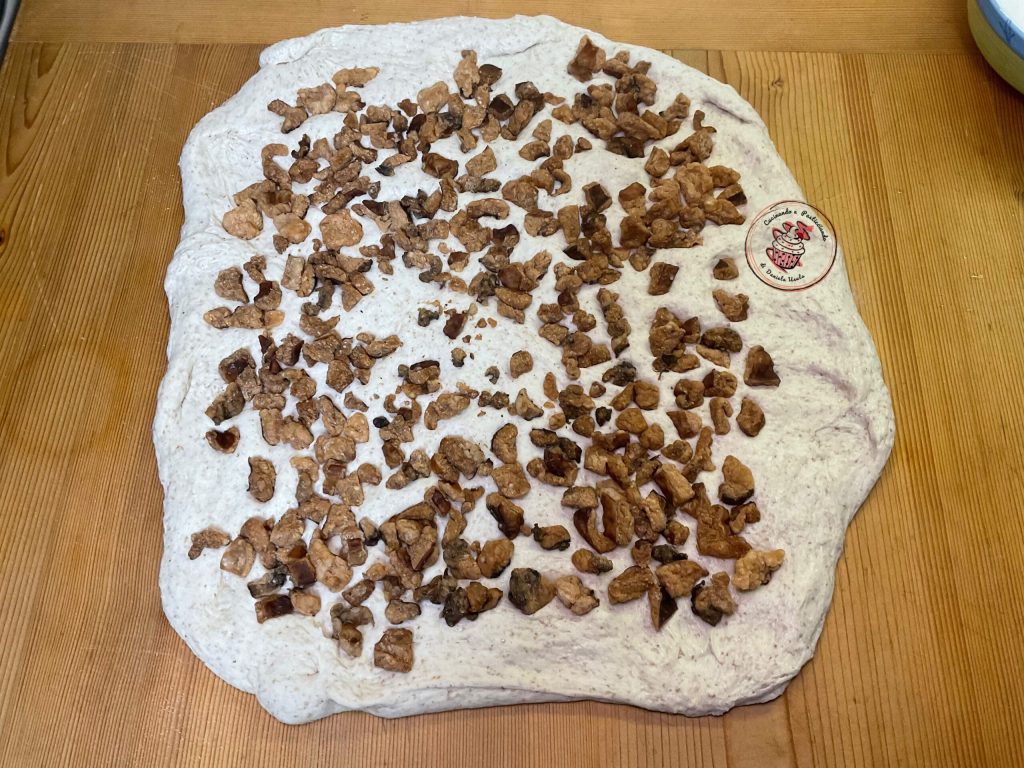 Transfer the dough back to the work surface, open it well, and add the pork cracklings.