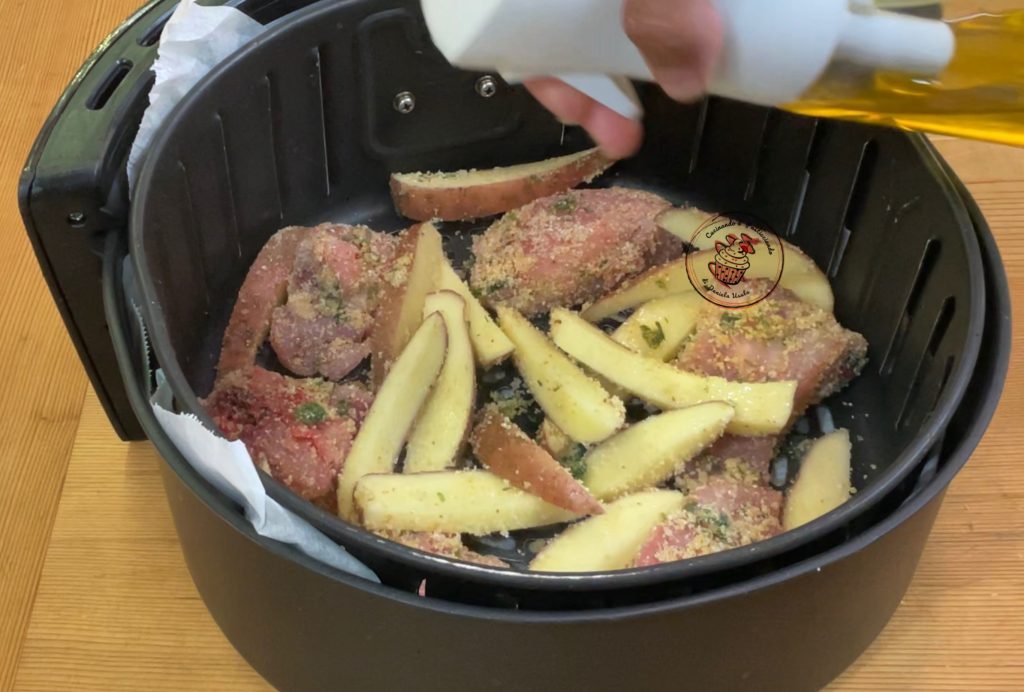 Place the rabbit pieces on the fryer basket, add the potatoes cut into wedges and also coated with breadcrumbs, and add a bit of oil. (I use the spray sprayer, which is very handy). Cook for about 20 minutes at 400°F.