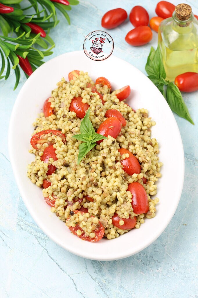 Carlofortina Style Fregula Sarda is a unique dish that combines the intense flavors of tuna, the freshness of cherry tomatoes, and the creaminess of pesto. A simple yet character-rich first course, perfect for summer days and inspired by the cuisine of Carloforte on the island of San Pietro in Sardinia. Ideal to enjoy hot or warm, it is a recipe that conquers at first taste.