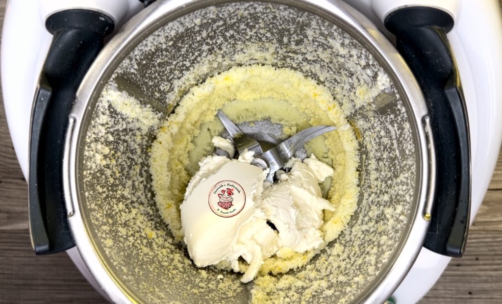 • Without washing the bowl, add the lemon zest and sugar and pulverize for 20 seconds at speed 10. Add the ricotta and the liquor and mix for 20 seconds at speed 4.
