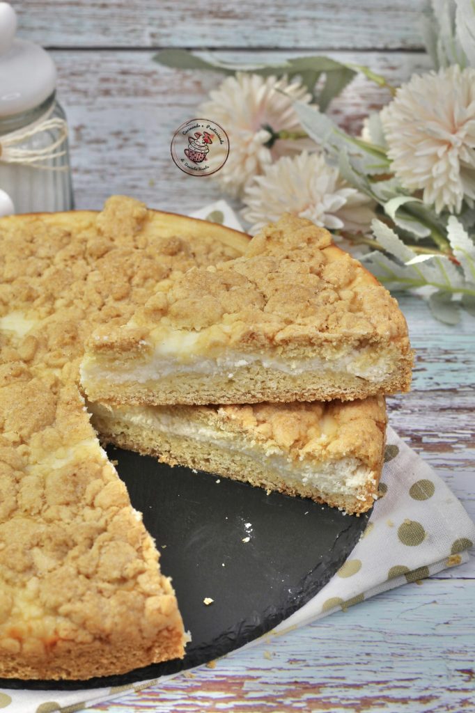 I love crumble cake, especially with ricotta cream. For my birthday, I decided to make it. It is very easy to prepare and very tasty. Moist, it melts in your mouth. I flavored both the pastry and the ricotta cream with lemon. But it’s also delicious with orange. I used the Thermomix, but it can easily be made by hand or with a stand mixer.