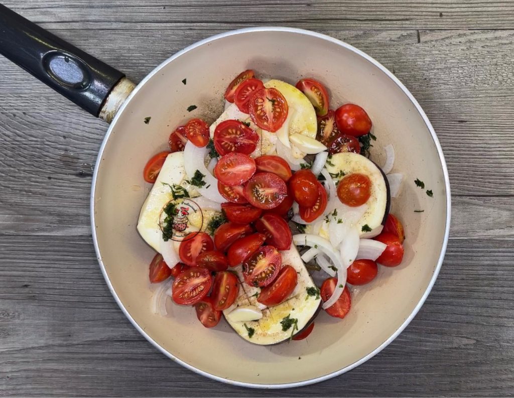 • Add oil, salt, sliced onion, chopped garlic, chopped parsley, and halved cherry tomatoes.