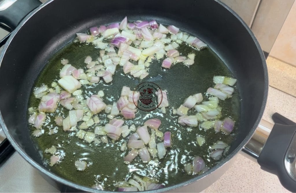 In a sufficiently large pan, sauté 1 chopped onion with some oil.