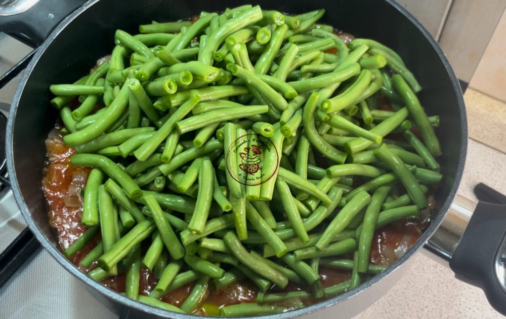 Wash 2.2 lbs of green beans, trim the ends, and add them to the tomato. If the green beans are very long, cut them in half. Mix well, cover with a lid, and cook for about 20 minutes, stirring occasionally.