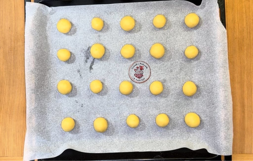 After the resting time, proceed by making small balls and placing them on the baking tray covered with parchment paper.