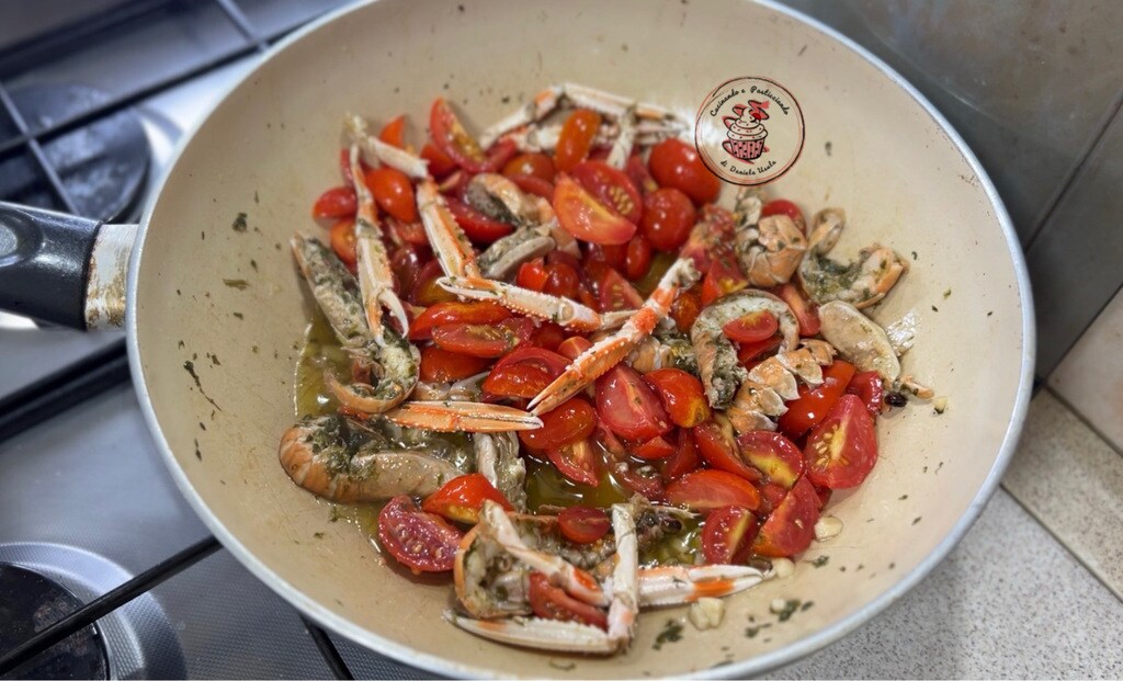 • Finally, add the halved cherry tomatoes and finish cooking for another 5 minutes. If you like, add some chili pepper.