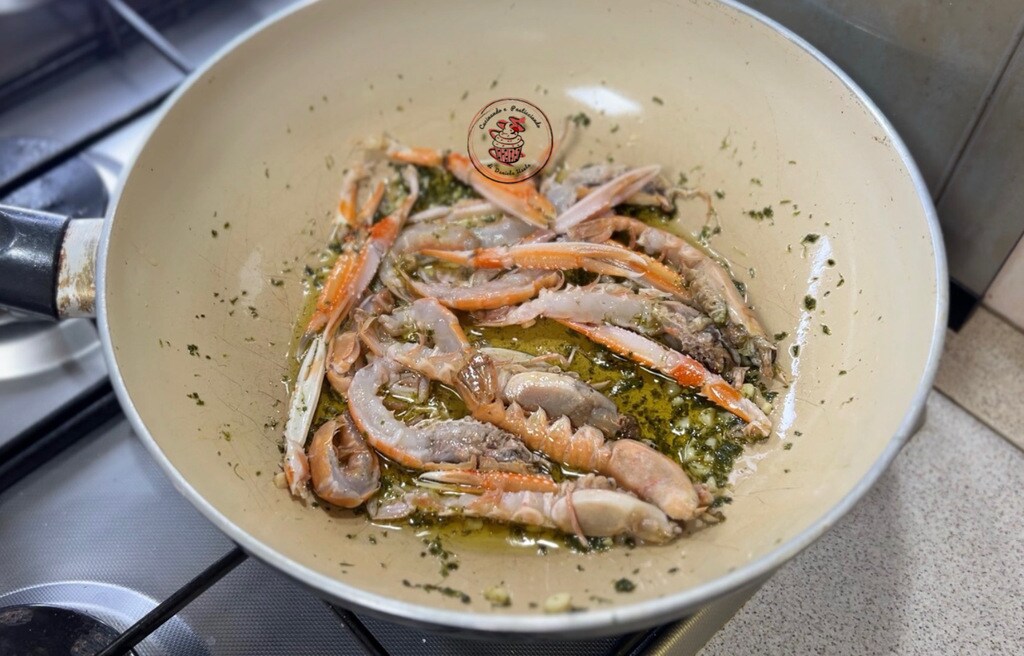 • Add the cleaned and halved scampi and cook for 5 minutes.