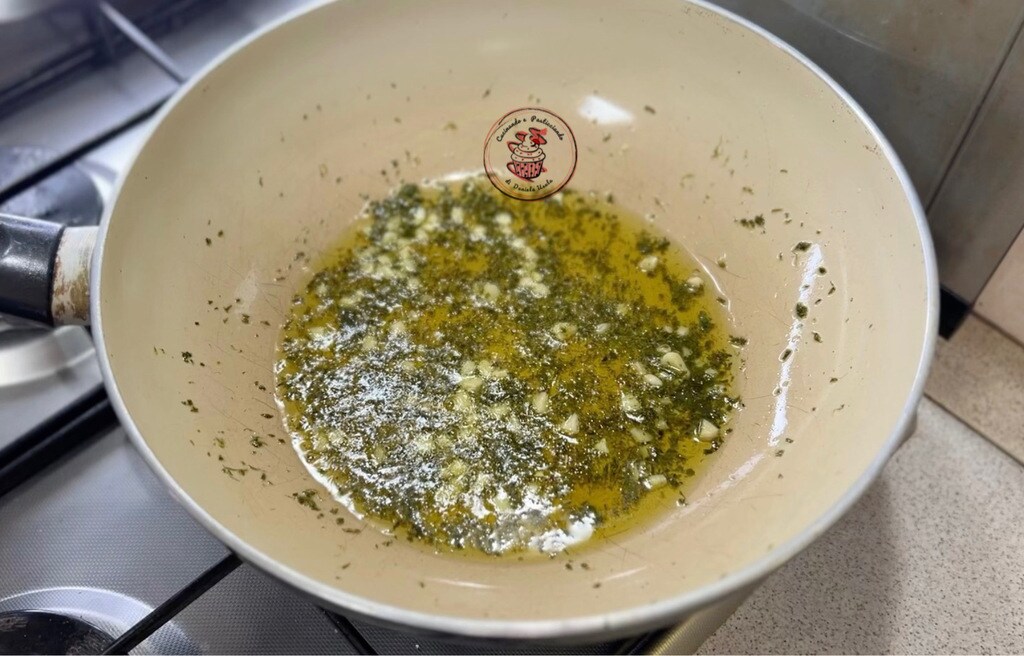 • In a pan, sauté the garlic and chopped parsley with plenty of olive oil.