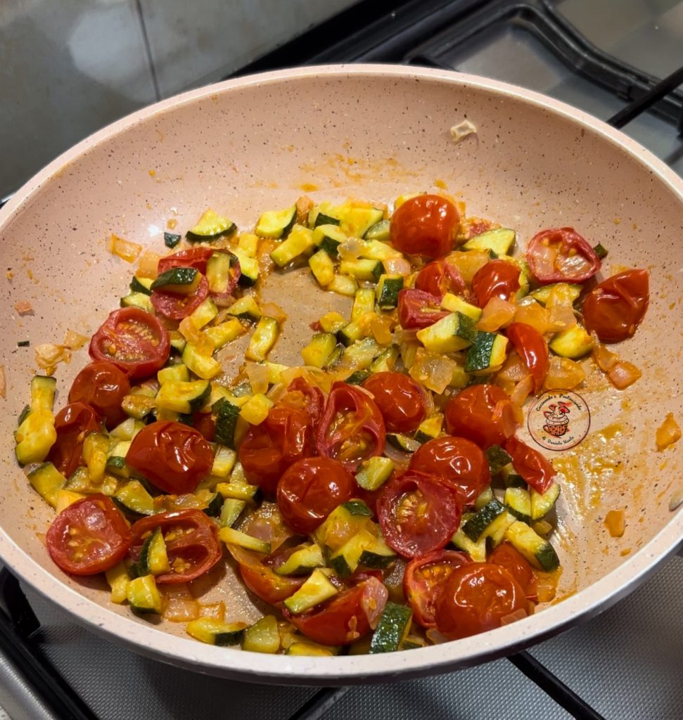 In a pan, sauté the zucchinis and cherry tomatoes with oil, salt, and the onion. Separately, boil the pasta in plenty of salted water, for the time indicated on the package.