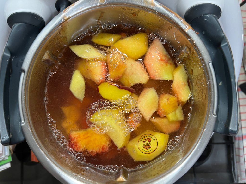 Wash the peaches, peel them, remove the pit, cut into pieces, and place in the Bimby bowl.