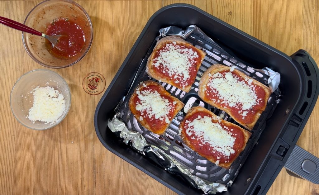 Add some seasoned tomato sauce to each slice, and cook for 5 minutes at 383°F.