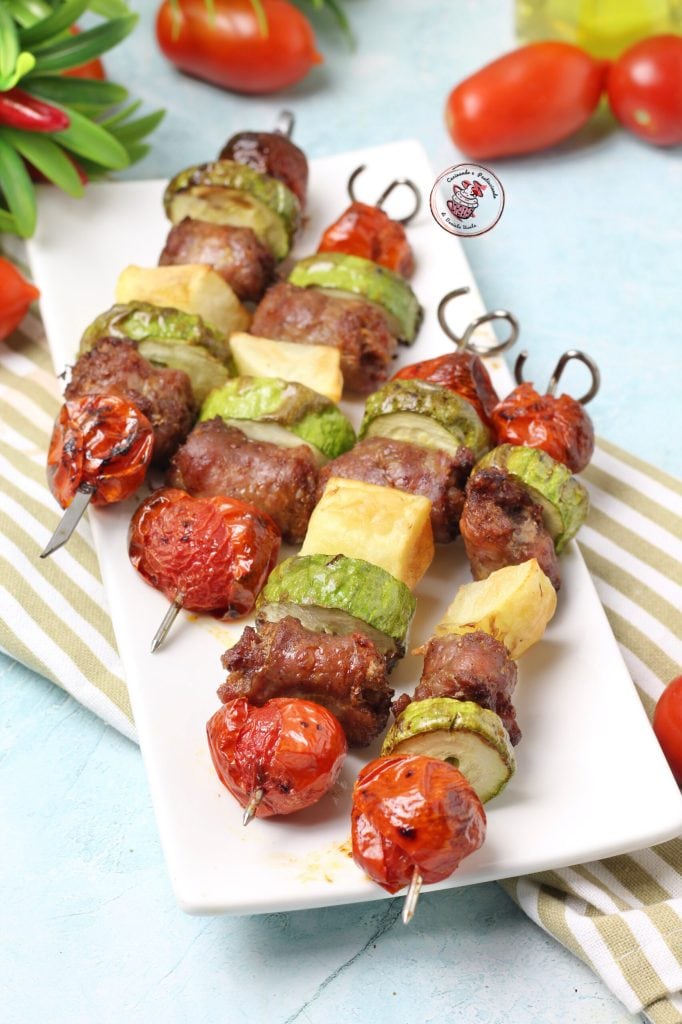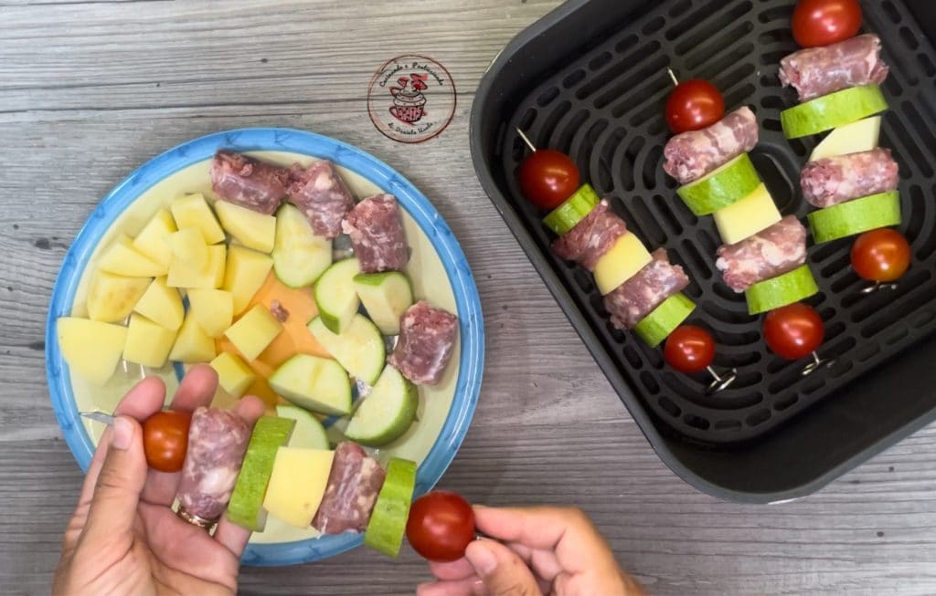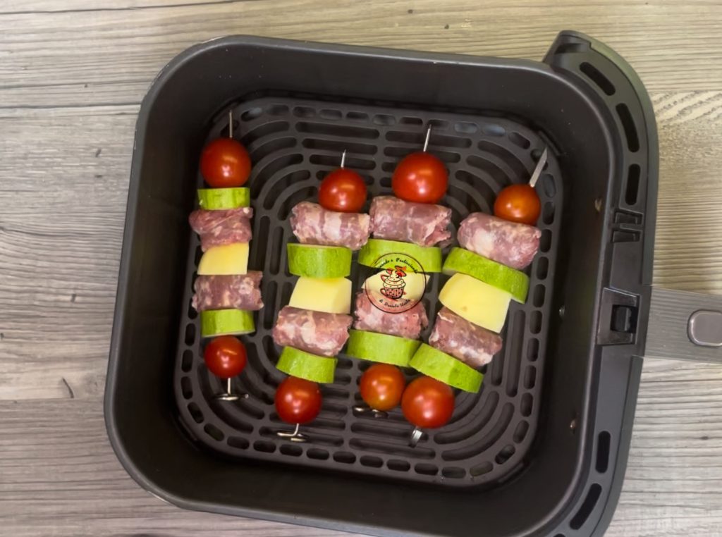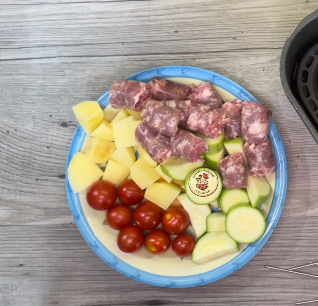 Today, a super quick lunch!!! I love skewers, I find them practical and they are always a big hit. Today I prepared them very simply, and to save time and effort I used the air fryer. I practically use it every day now. For the skewers I used sausage and some vegetables I had in the fridge. But you can use chicken or any meat you like. Look at how many ideas can be made with skewers.