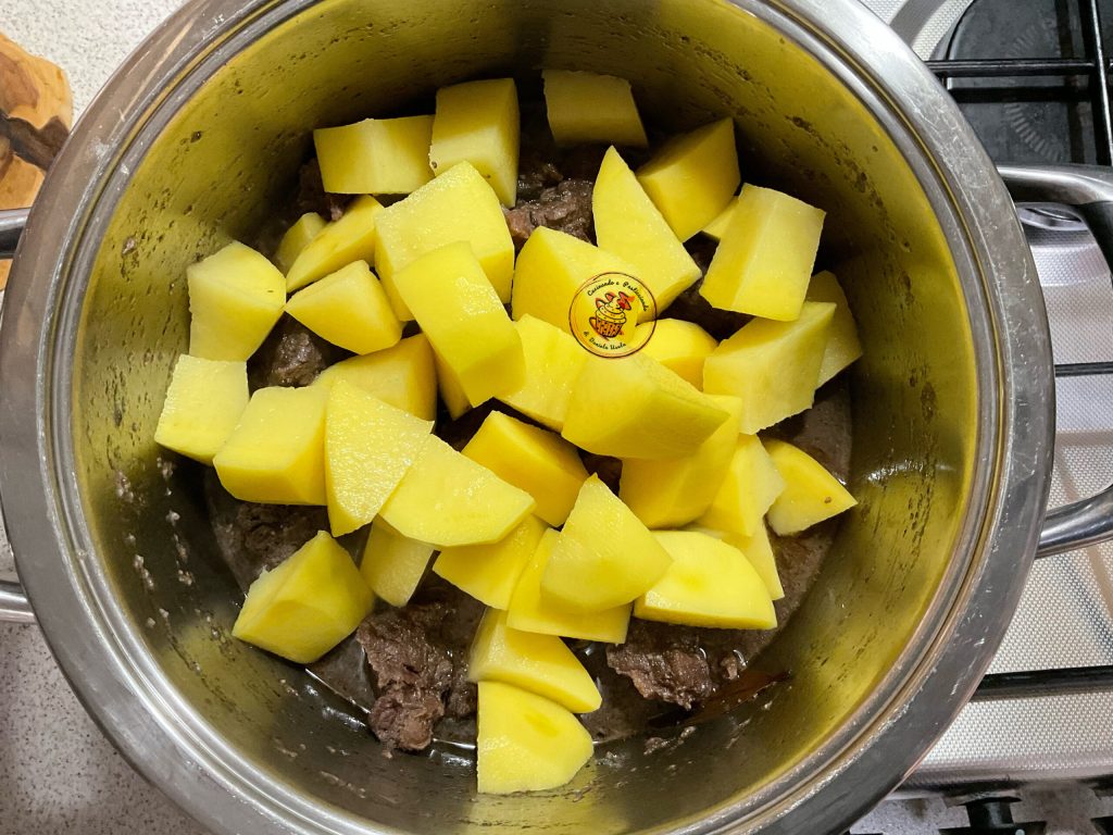 Taste the meat, if it’s almost cooked add the cleaned and diced potatoes. Stir and continue cooking for another 10/15 minutes.