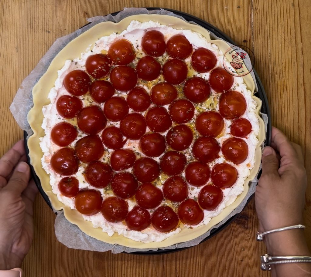 After the success of the Savory Pie with Zucchini and Tomatoes, today I prepared a savory pie with ricotta and cherry tomatoes, delicious and super quick to make. I love savory pies, as you already know. I like to constantly experiment with new flavors. I had already tried the combination of ricotta and tomatoes, but not in a savory pie, and I must say that I really liked the result. Next time, I’ll add mortadella too. I think it will be a great addition, don’t you think?