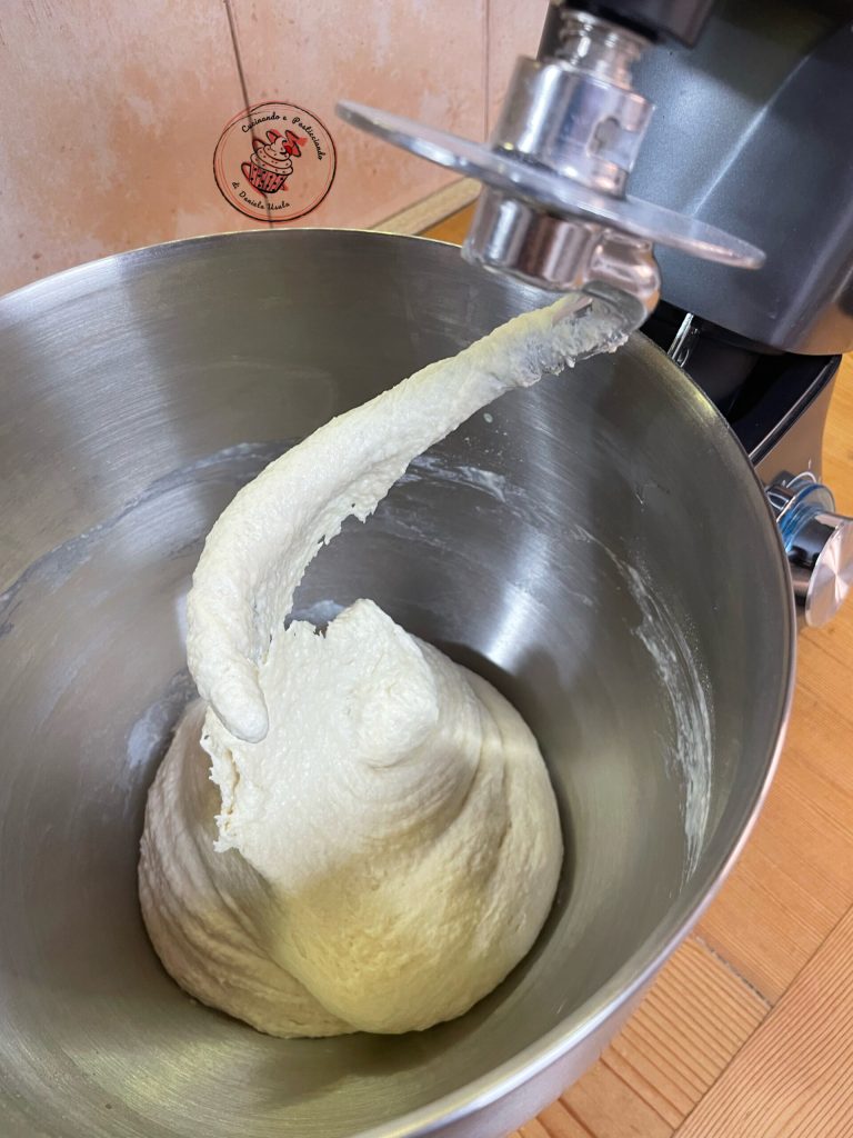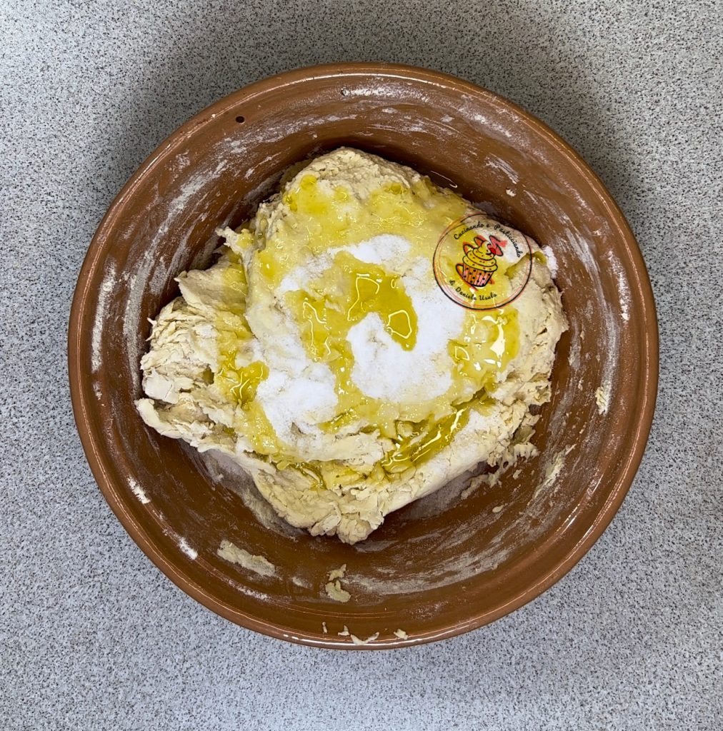 Add the oil and salt. Knead well until forming a homogeneous ball and let rise, covered with plastic wrap, until doubled.