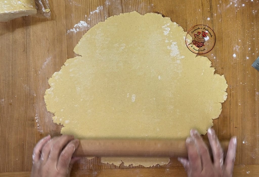 After the resting time, take the shortcrust pastry and roll it out on a floured work surface.