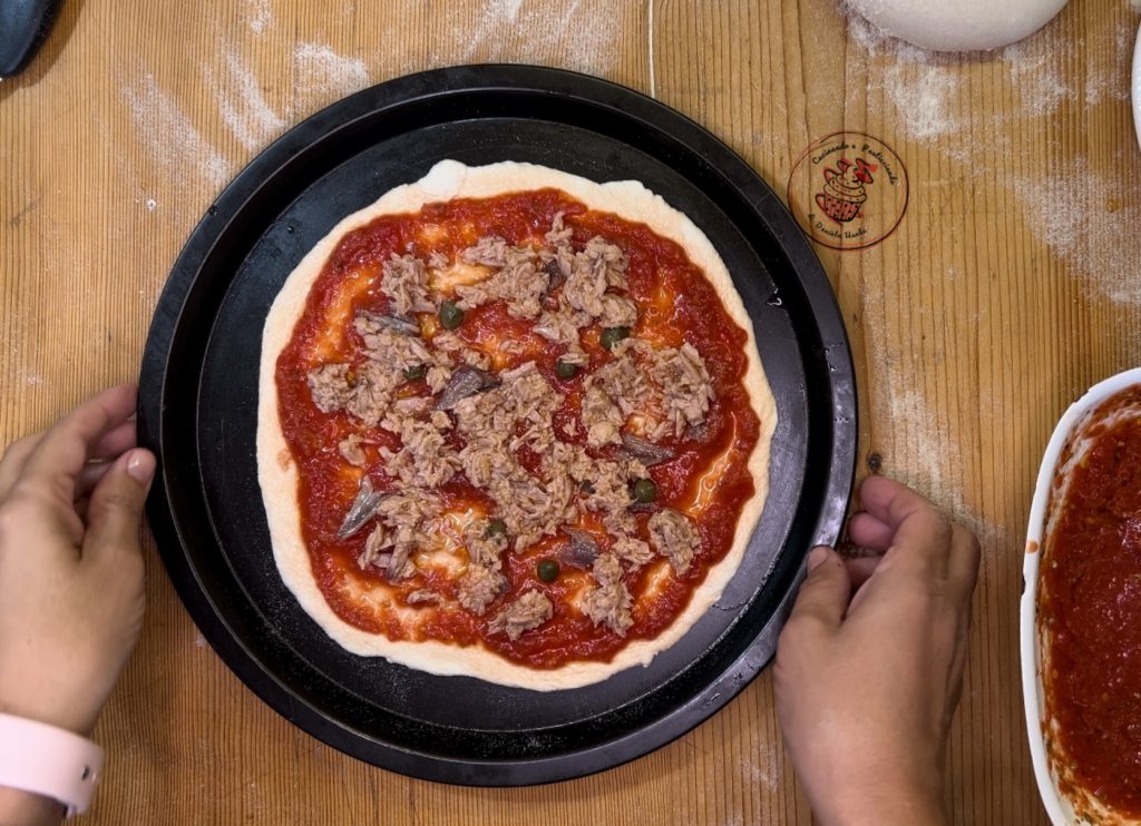 • 3 pizzas topped with capers and anchovies, margherita, and tuna.