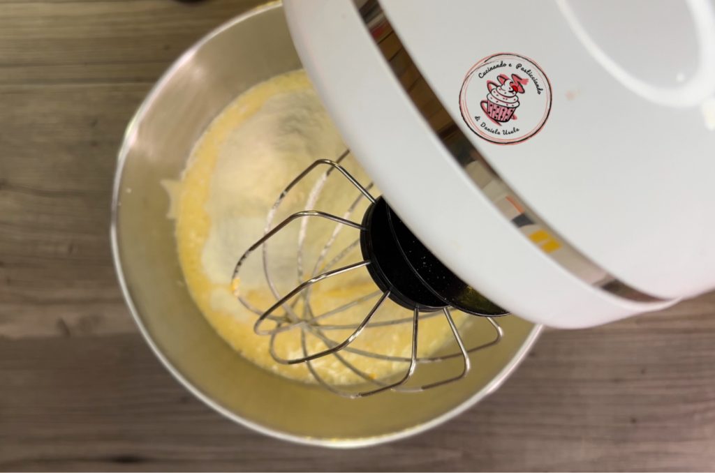 Finally, add the flour, starch, vanilla, and baking powder and mix for another 5 minutes.