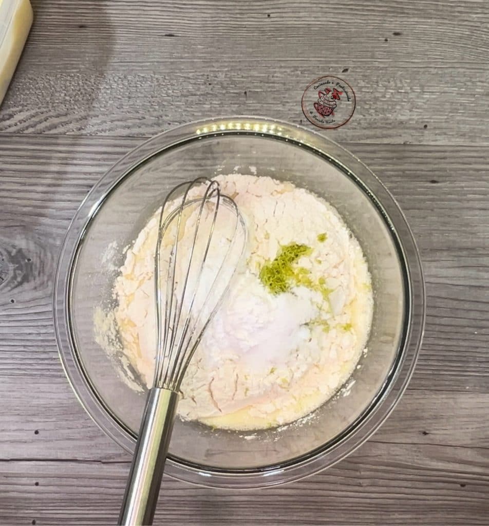 Then add milk, oil, flour, baking powder, vanilla, and lemon zest, and mix well with the whisk until the batter is smooth and lump-free.