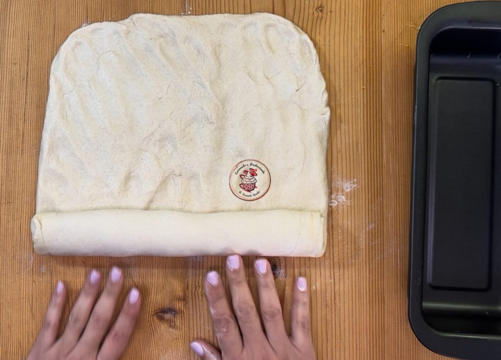 Roll out the dough on the counter and form a rectangle. Roll it from the shorter side.