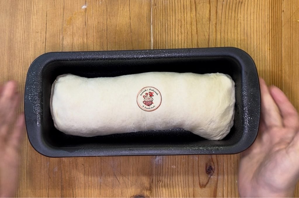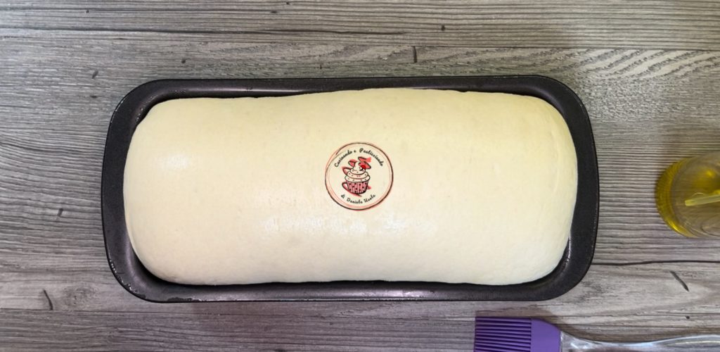 Grease the loaf pan and place the dough inside. Cover with plastic wrap and let it rise until it reaches the edge. This will take about 1 hour.