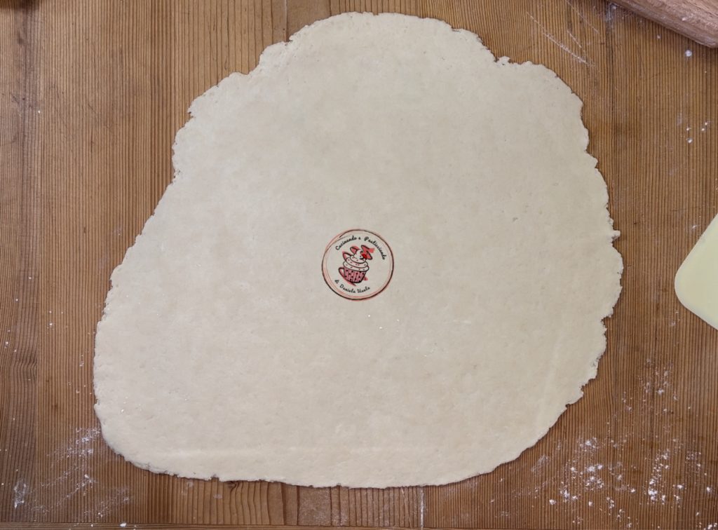 After the resting time, roll out the pastry with the rolling pin on a lightly floured surface.