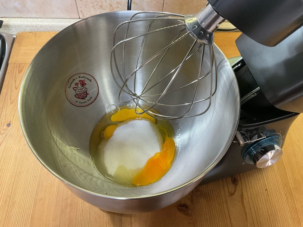 Work the sugar with the eggs in the stand mixer for about 10 minutes, they should be fluffy and foamy.