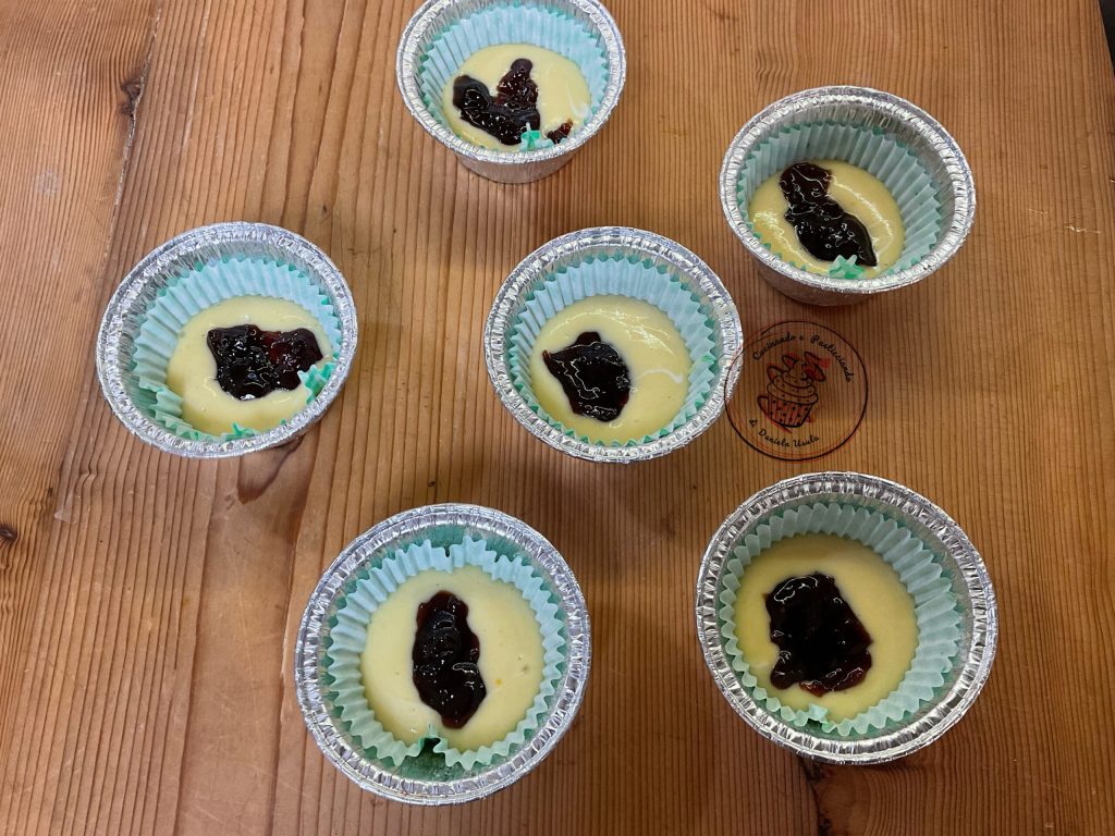 Mix everything again for about 5 minutes. Then pour 2 tablespoons of batter into the liners, and add 1 teaspoon of jam.