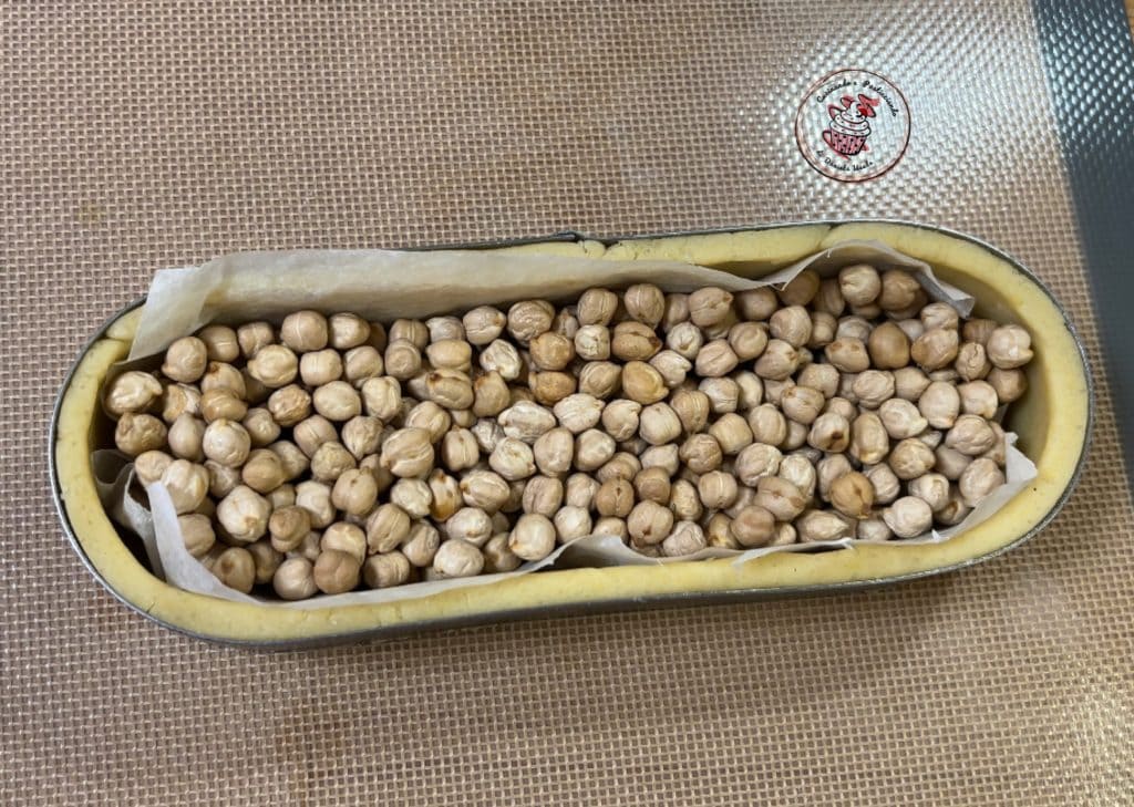 This tart requires “blind baking,” meaning baking without filling. Simply line your tart with parchment paper and use weights to prevent it from puffing up during baking. I always use chickpeas (they are no longer suitable for consumption after the first use). Once cooled, you can use them for every blind baking.