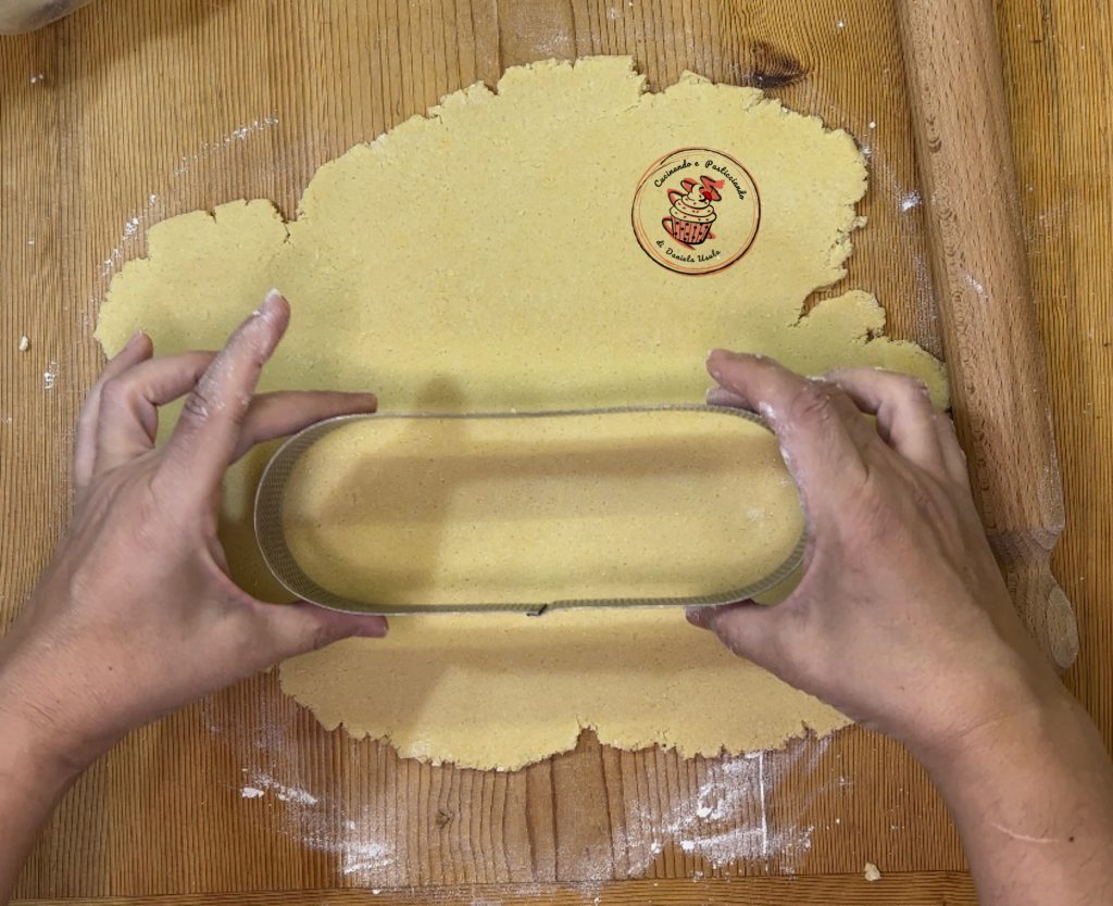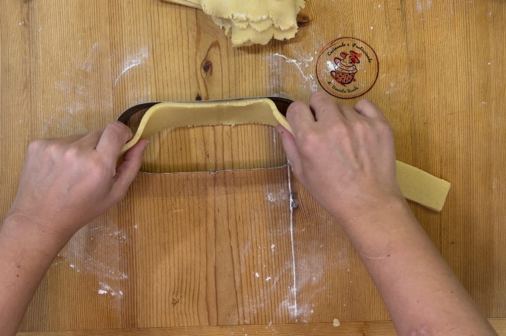 Prepare the sides. Roll out the shortcrust pastry and cut a long strip. For the measurement, you can use the ring.