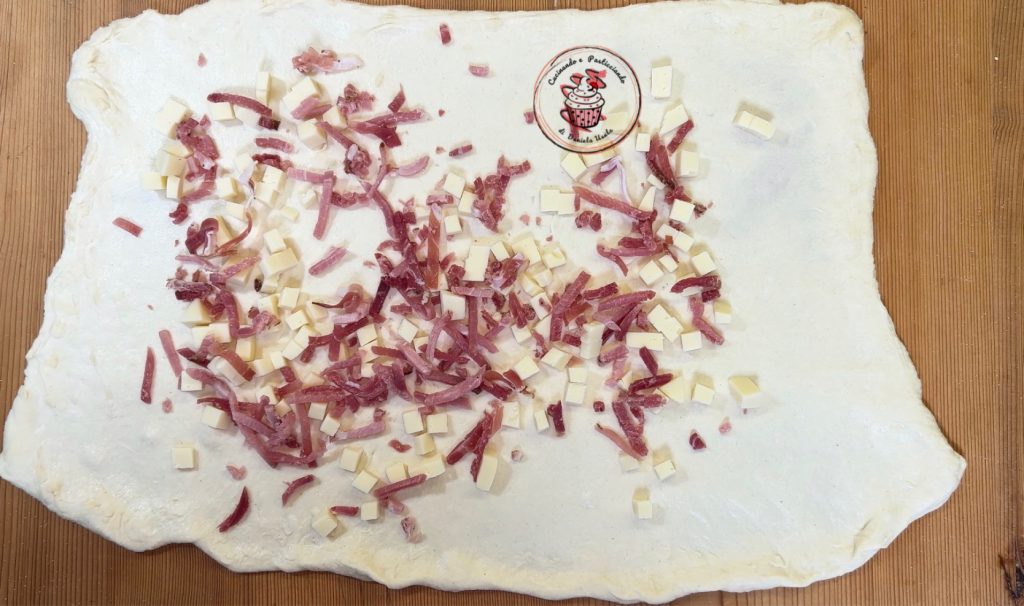 Open the dough again like a sheet and fill it with speck and provola.