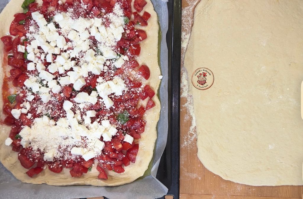 Roll out the first part and place it on a baking tray lined with parchment paper and oiled. Add the tomatoes.