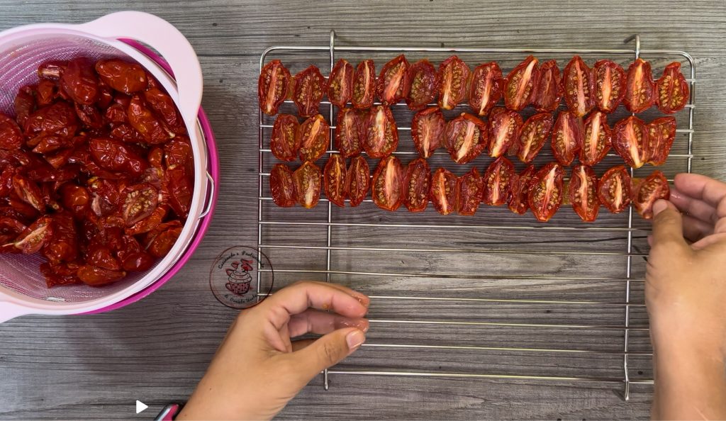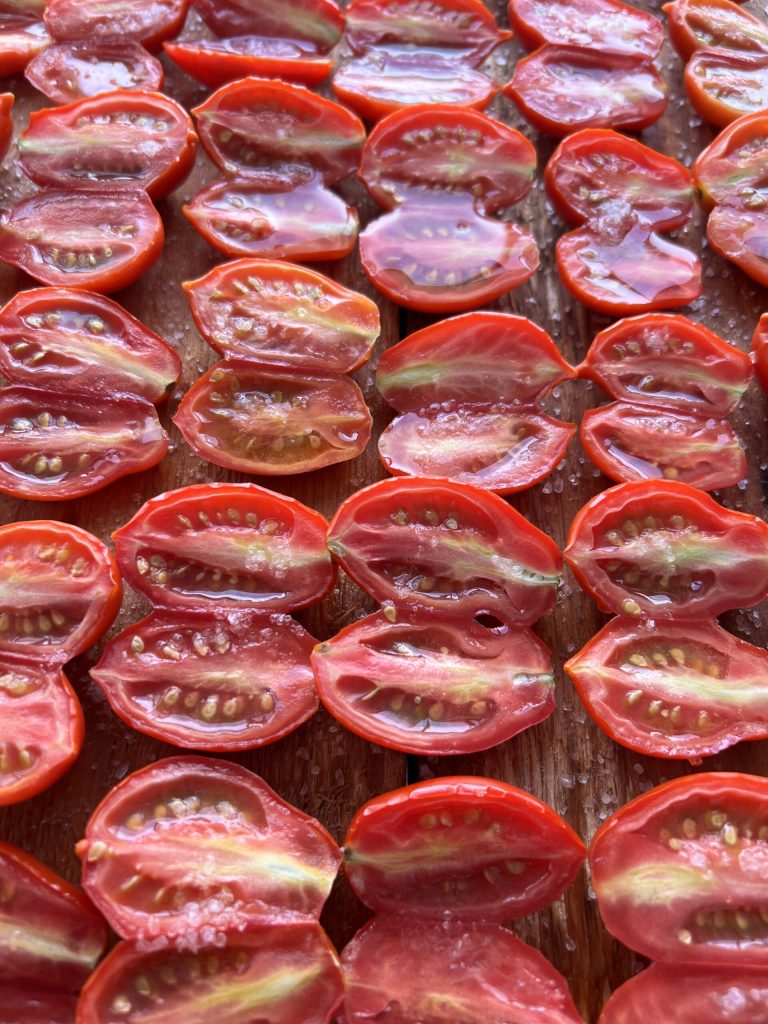 Wash the cherry tomatoes thoroughly, cut them in half without completely separating them, and place them on a tray. I use special wooden boards or racks. Add salt and let them dry in the sun for about 3/4 days. You need to monitor them.
