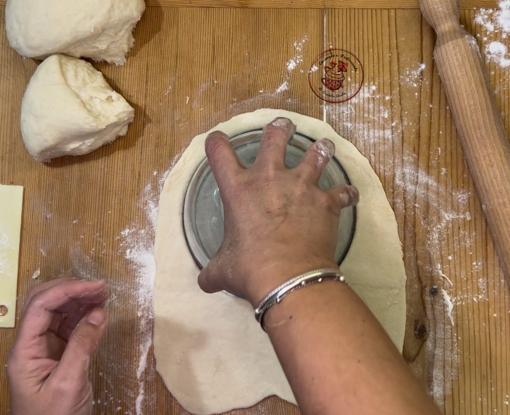 Let the dough rest for a couple of minutes, then roll it out thin with the rolling pin and cut out circles.