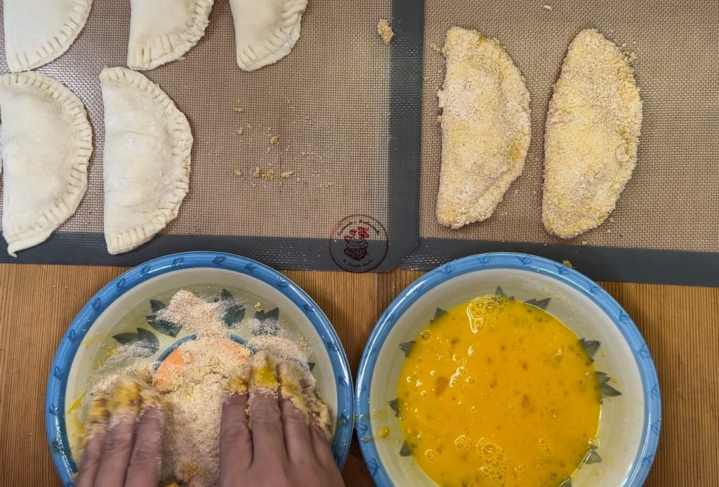 Dip the stuffed pockets in beaten eggs and breadcrumbs.