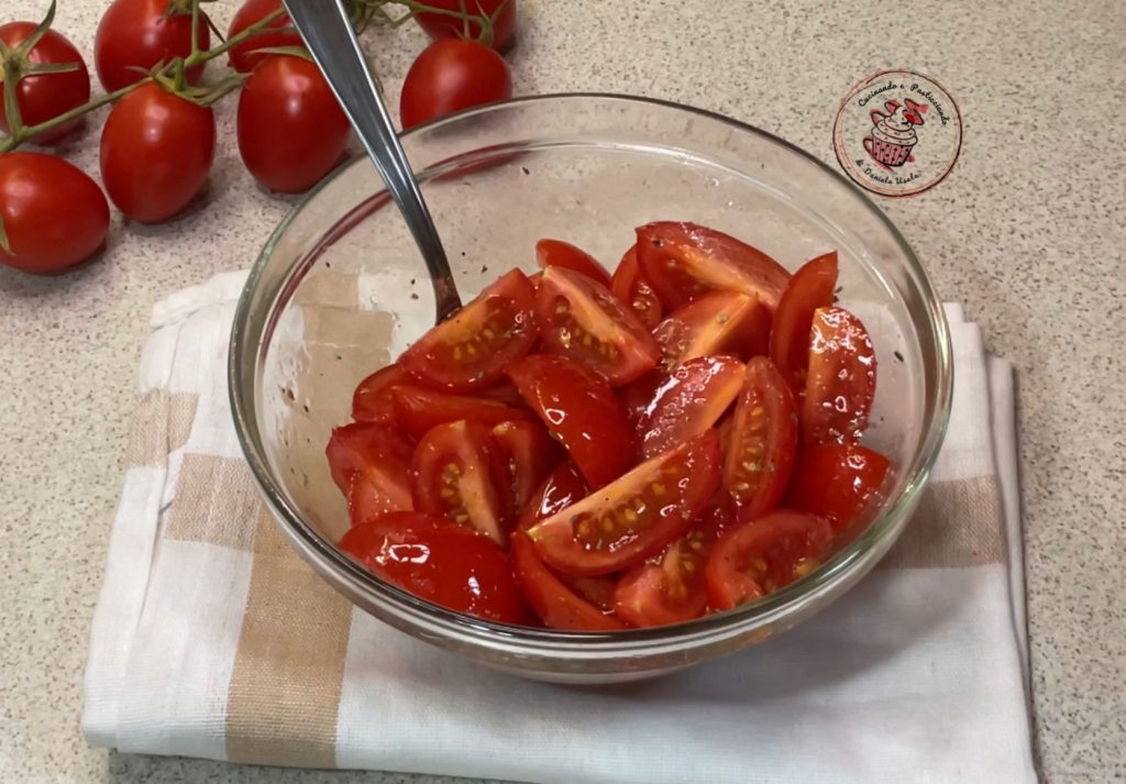 Separately prepare the cherry tomatoes, cut them into quarters and season them with oil, salt, and oregano.