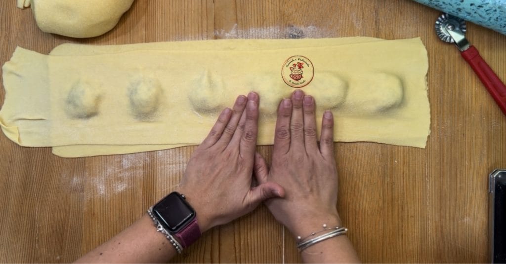 Use the pasta cutter wheel to cut the ravioli. Make them nice and large, remember.