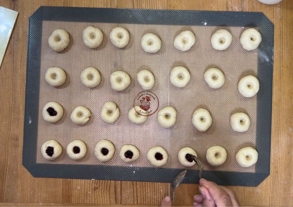 • Place the balls on the baking mat (if you don’t have one, a tray lined with parchment paper will do). With the tip of a floured ladle, make holes in the center.