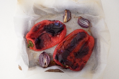 • First, wash the peppers, peel the onion, and cut into 4 parts. Place the vegetables on the baking tray lined with parchment paper. Preheat the oven to 400°F (200°C) and cook for about 35 minutes. Once cooked, remove the vegetables from the oven and put the peppers in a paper bag to cool. Finally, remove the pepper skin and cut into pieces.