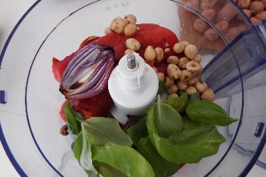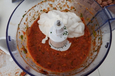 • Prepare the sauce for the meatballs. Place the peppers, onion, basil leaves, peeled garlic, hazelnuts, oregano, and sweet paprika in the food processor. Blend until you get a smooth and slightly grainy consistency