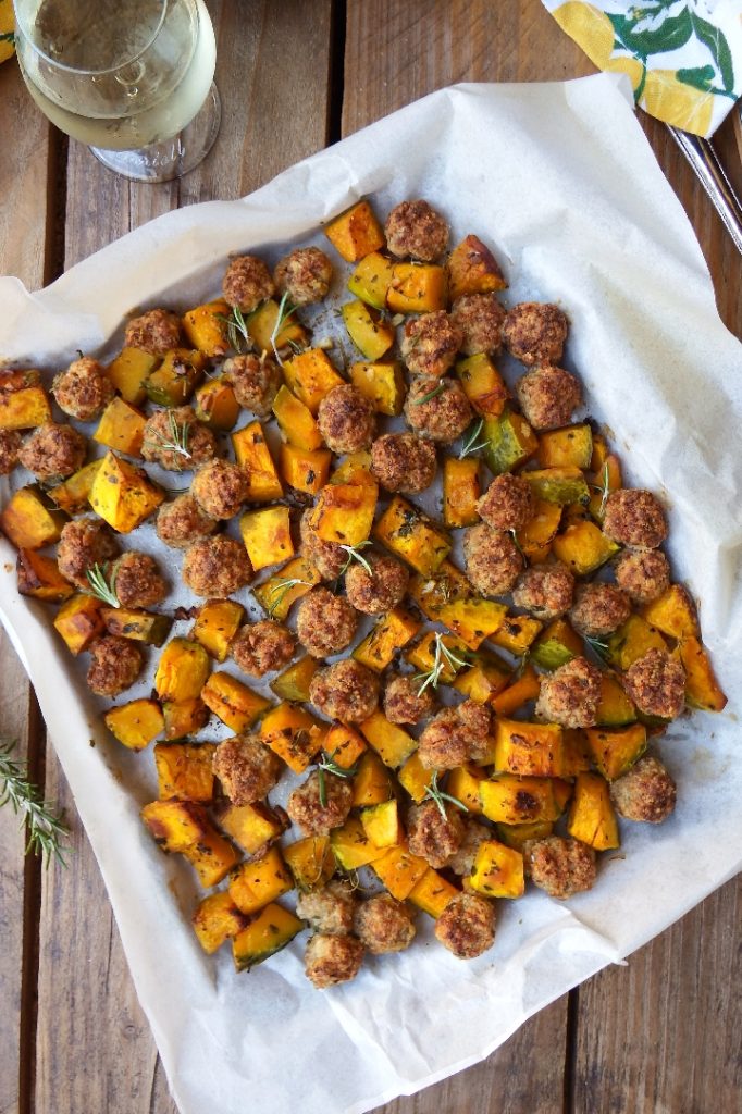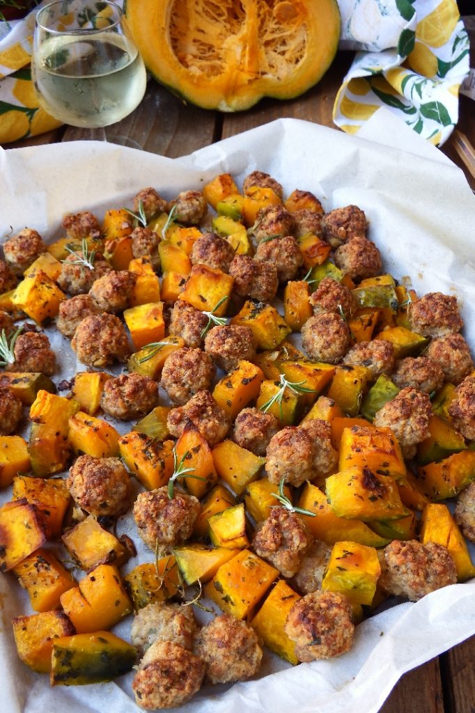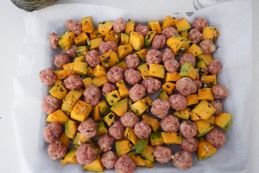 Pour a drizzle of oil over the bottom of the baking dish lined with parchment paper, add the squash and meatballs, and cook in a static oven at 356°F for about 40 minutes, shaking the pan halfway through cooking, and cook until the dish is golden.