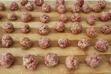 Work the mixture for a long time to make it well blended. Shape into small meatballs and roll each in breadcrumbs. Let the meatballs rest for 30 minutes in the refrigerator.