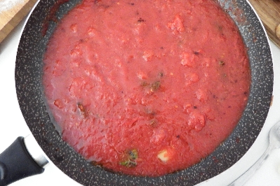 • Blend the peeled tomatoes with an immersion blender. Peel the garlic clove and place it in a pan with a drizzle of oil, add the tomato pulp, and continue cooking for 10-15 minutes until the sauce starts to thicken. Adjust with salt, and a few basil leaves