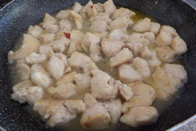 First, cut the chicken into cubes and flour it. Add a drizzle of oil to the pan where you cooked the vegetables and place the chicken in