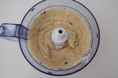 • Put the cooked chickpeas, ricotta, egg, grated Parmesan, minced garlic, and a tablespoon of chopped parsley into the food processor. Blend until smooth and creamy.