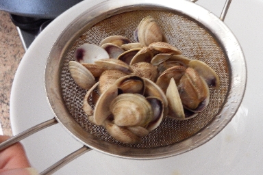 • Discard any shellfish that have not opened, shell the clams, and strain the cooking water through a fine sieve and set aside. Keep a few clams in the shell to decorate the dish.